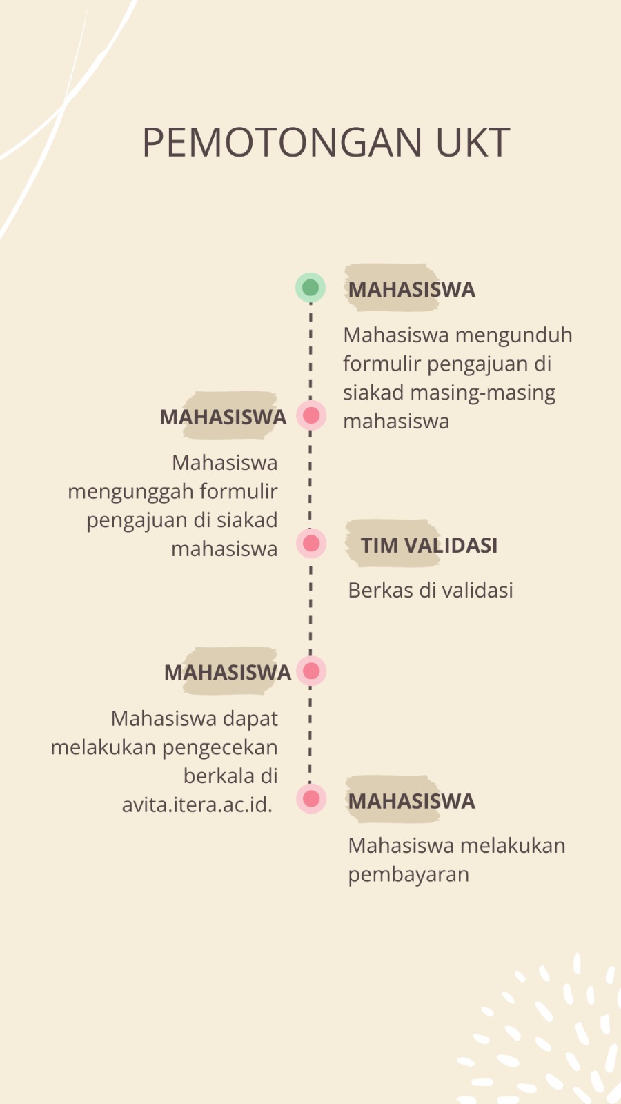 PEMOTONGAN UKT FAKULTAS SAINS Lini Masa Pengajuan Pemotongan UKT Fakultas Sains :Silahkan merujuk pada Surat Edaran Pembayaran UKT Terbaru, Pengajuan yang tidak didasari oleh Edaran akan secara otomatis ditolakPrasyarat Pemotongan UKT Fakultas SainsMahasiwa Semester 9 atau lebihBagi Mahasiswa yang memiliki sisa mata kuliah yang belum ditempuh paling banyak 6 (enam) satuan kredit semesterPengurangan pembayaran UKT sebesar 50% (lima puluh persen) dari besaran UKT (Permendikbudristek No 2 Tahun 2024 Pasal 13 Ayat 2a dan Pasal 13 Ayat 4) Alur Pemotongan UKT Formulir Pemotongan UKT Fakultas Sains