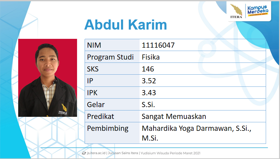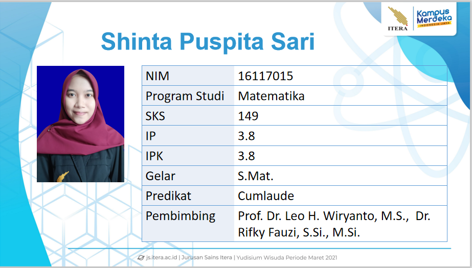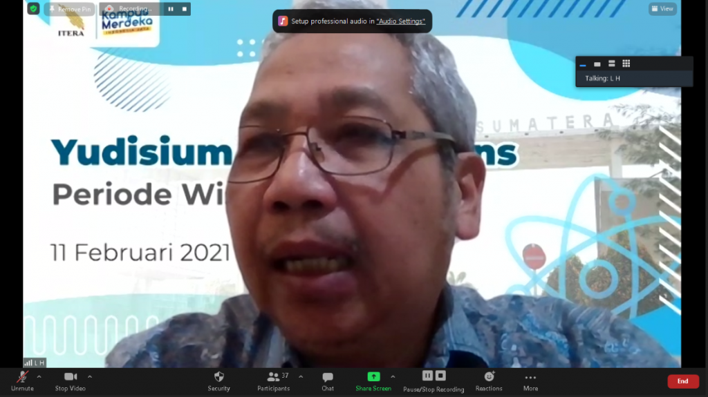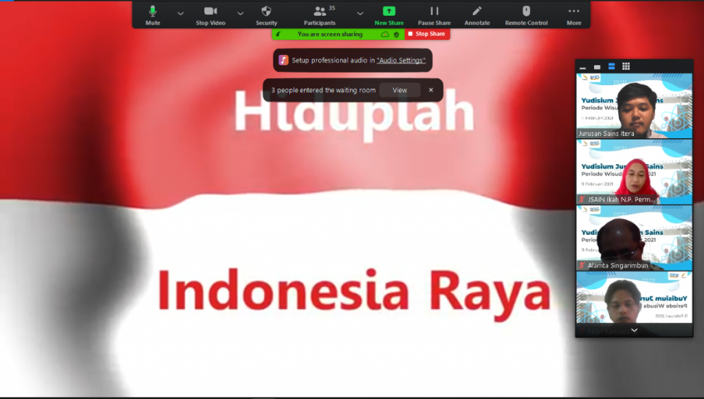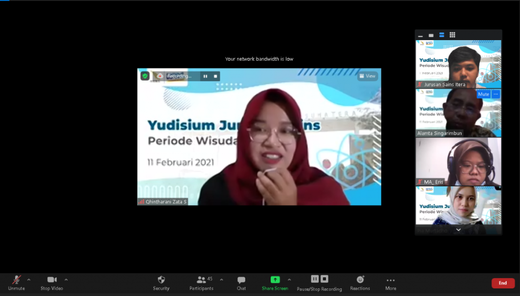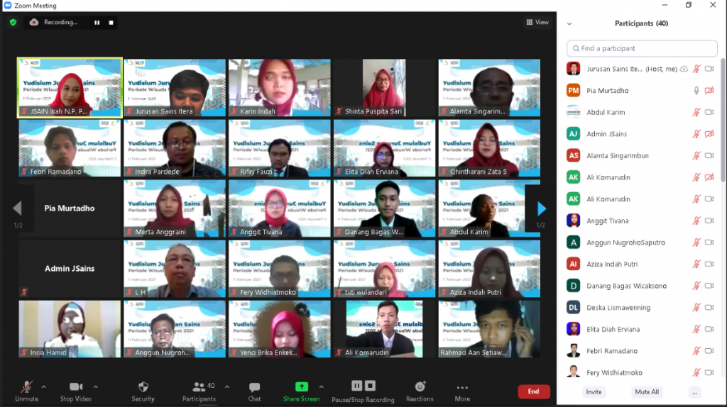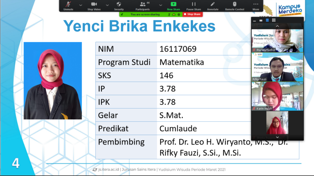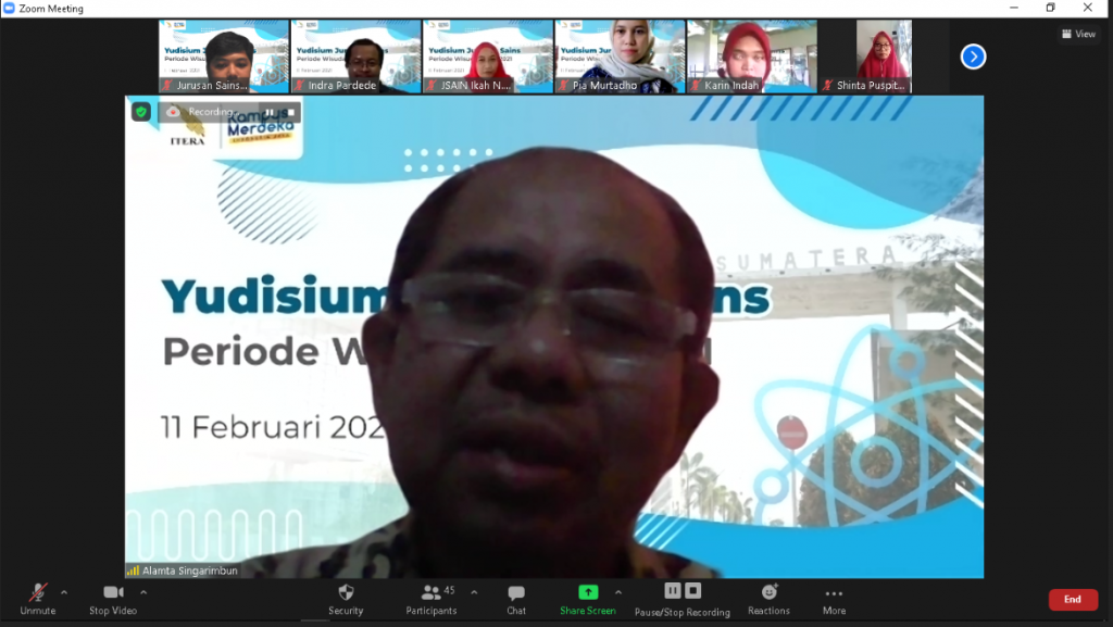 Berita – Di tengah pandemi COVID-19, untuk mengurangi rantai penyebaran virus corona, Jurusan Sains Itera menggelar Yudisium secara dalam jaringan (daring) via aplikasi Zoom meeting, Kamis (11/2).