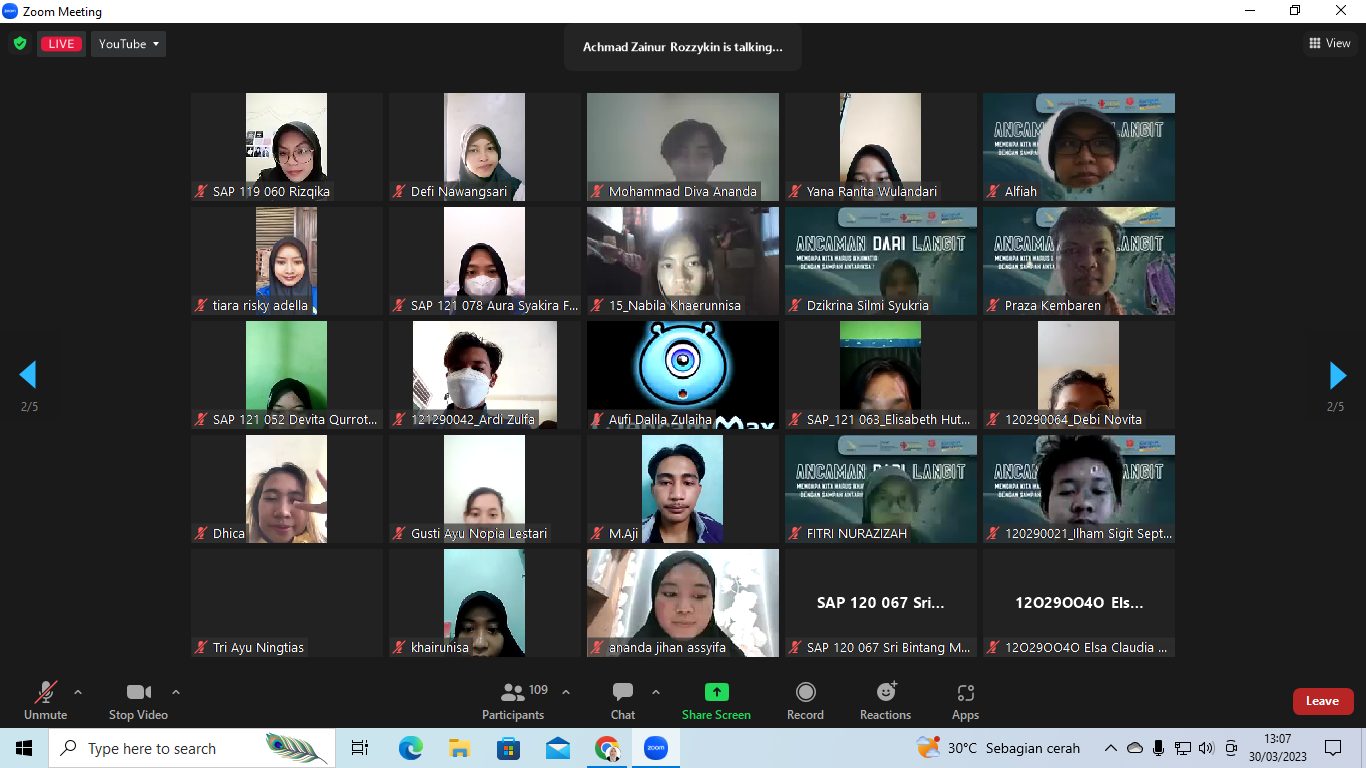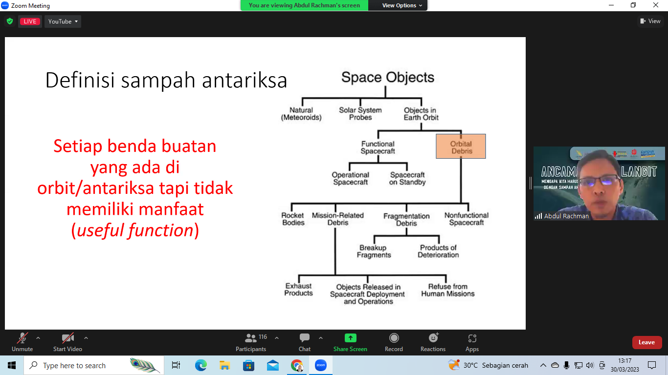 Bapak Abdul Rachman menjelaskan tentang sampah antariksa dan kondisi sampah antariksa saat ini dan risiko di masa depan. Ada dua cara mitigasi sampah antariksa, sehingga tidak menjadi awan debris, yaitu secara pasif dilakukan dengan mencegah terjadinya awan debris merujuk panduan mitigasi dan aktif dilakukan dengan memindahkan debris. Bapak Abdul Rachman memberitahukan bahwa Observatorium Nasional Timau (Obnas Timau) menjadi sangat penting dalam usaha mitigasi ancaman sampah antariksa, terutama yang dapat berisiko jatuh ke Indonesia dengan melakukan pengamatan sampah antariksa dan objek dekat Bumi (Near-Earth Object, NEO). Di akhir sesi Bapak Abdul Rachman memberi kesempatan pada peserta yang hadir untuk bertanya dan berdiskusi. Di akhir sesi beliau menekankan bahwa sampah antariksa adalah masalah global yang belum memiliki solusi yang sempurna. Meskipun begitu, sampah antariksa adalah tantangan, karena satelit sangat berguna untuk kehidupan kita, dan mahasiswa dapat terus belajar untuk berperan aktif dalam mitigasi dan pemindahan debris.