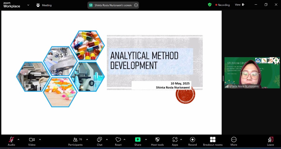 Dipandu oleh moderator apt. Winni Nur Auli, M.S.Farm., sesi pertama apt. Shinta Rosia, S.Farm., yang menjabat sebagai Analytical Development Scientist di PT Dankos Farma. Dalam pemaparannya, apt. Shinta Rosia menjelaskan bahwa pengembangan metode analisis memiliki peran strategis dalam menjamin mutu serta efisiensi proses formulasi obat. Tahapan yang dilalui meliputi studi literatur, perencanaan analisis, uji coba, hingga validasi metode. Beberapa teknik analisis yang umum digunakan dalam industri turut disampaikan, seperti High Performance Liquid Chromatography (HPLC), Ultra High Performance Liquid Chromatography (UHPLC), dan titrasi.