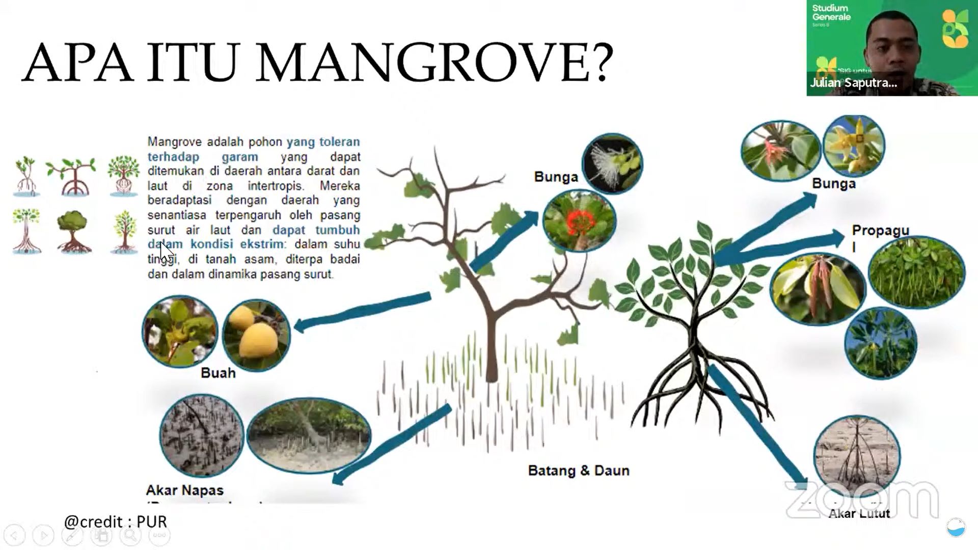 Julian Saputra, S.Kel., M.Si., memaparkan materi terkait SIG untuk pemetaan mangrove dengan bahasan utama yaitu penjelasan apa itu mangrove, penjelasan dasar penginderaan jauh untuk mangrove, pengolahan data dan klasifikasinya, serta penggunaan drone untuk kebutuhan pengamatan mangrove. Di mana bahasan ini akan mendorong perubahan secara besar bidang-bidang agroforestri dan reforestasi, konservasi hutan, pertanian, restorasi pesisir, dan pengembangan potensi pesisir untuk mulai digitalisasi. Vegetasi mangrove umumnya dipetakan menggunakan NDVI untuk melihat indeks kehijauan suatu vegetasi, di mana didasarkan oleh zat hijau daun (klorofil). Dengan indeks 1 untuk vegetasi hingga -1 untuk non vegetasi. Sebelumnya Julian Saputra, S.Kel., M.Si., juga membantu meluruskan karena banyak orang salah tanggap bahwasannya bakau adalah mangrove, akan tetapi mangrove adalah suatu ekosistem yang besar di mana salah satunya terdapat jenis bakau.