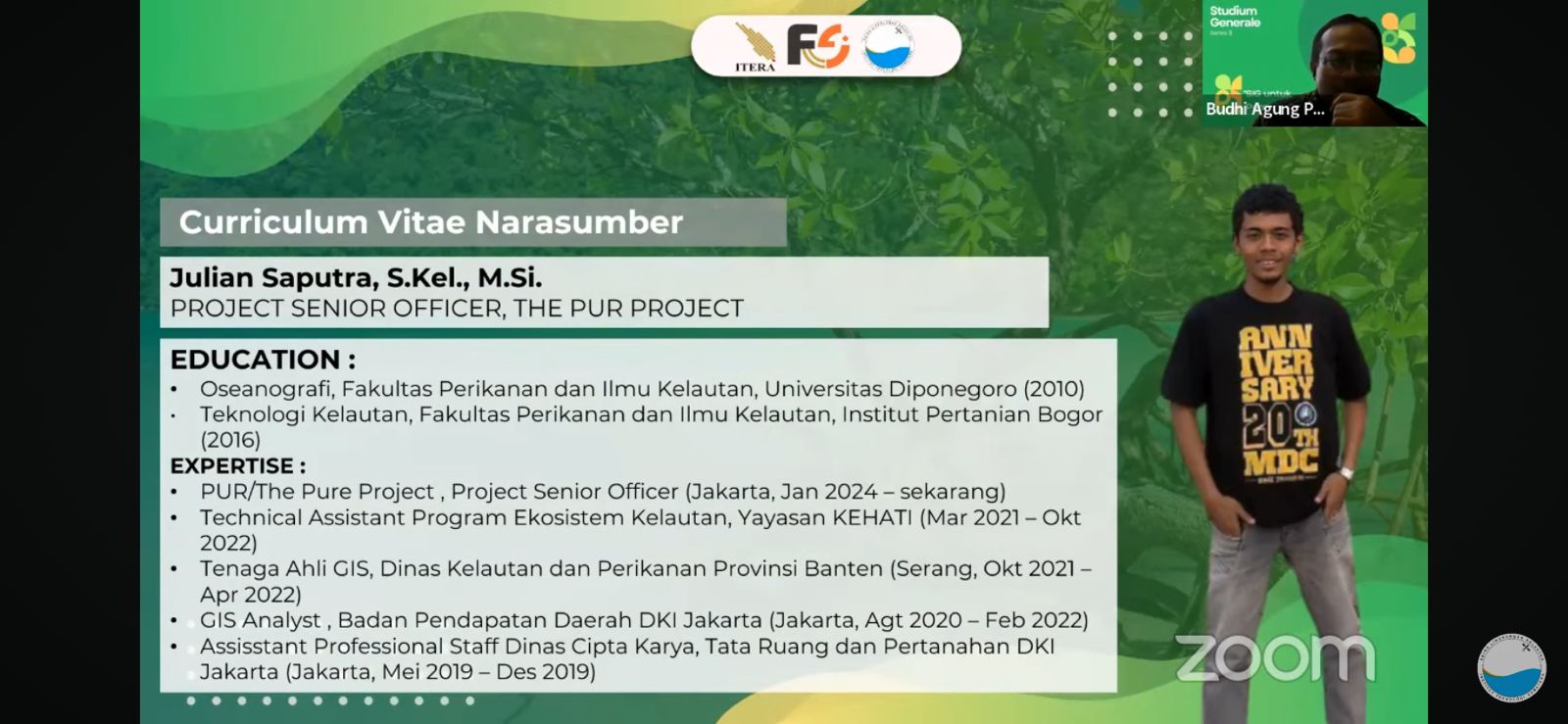 Program Studi Sains Lingkungan Kelautan Fakultas Sains, Institut Teknologi Sumatera (Itera) sukses mengadakan Studium Generale berjudul SIG untuk Pemetaan Mangrove. Acara yang diselenggarakan pada Kamis, 14 November 2024 secara daring melalui Zoom Meeting ini mengundang Narasumber Julian Saputra, S.Kel., M.Si., yaitu seorang Project Senior Officer dari The PUR Project.