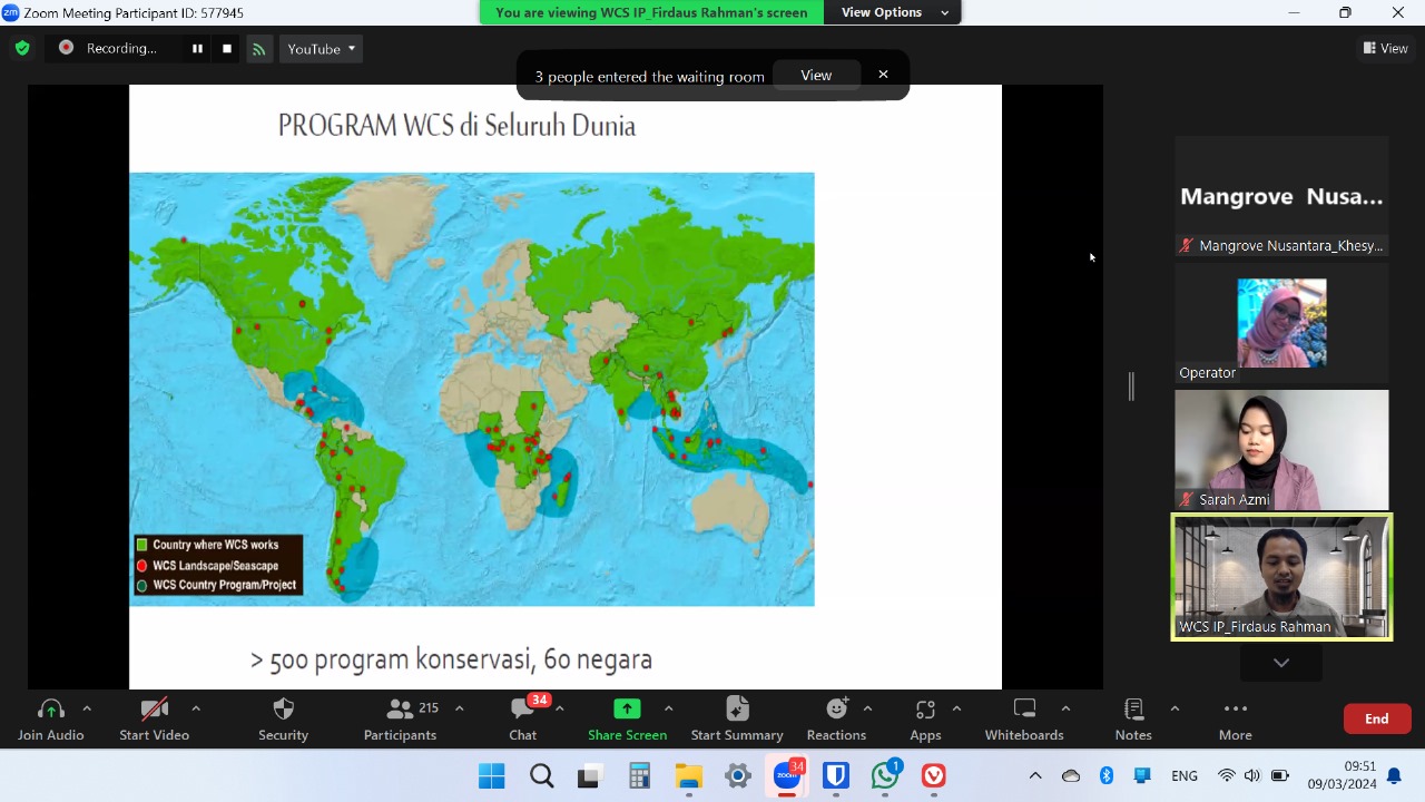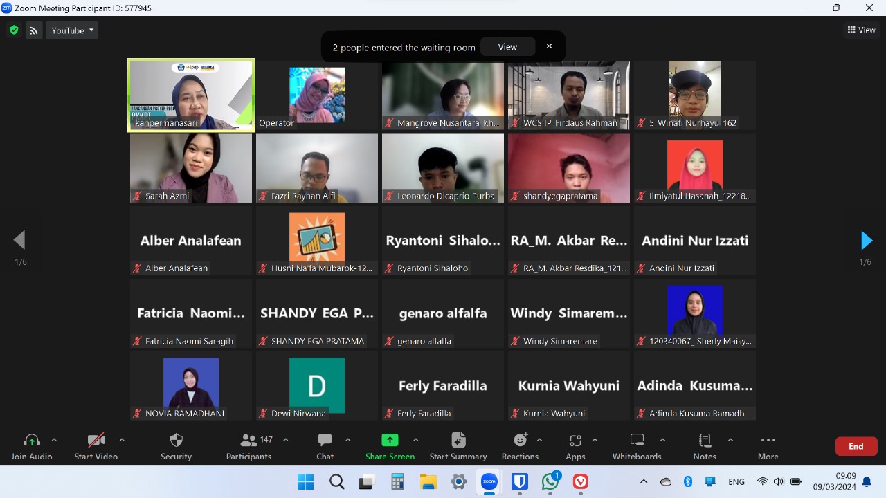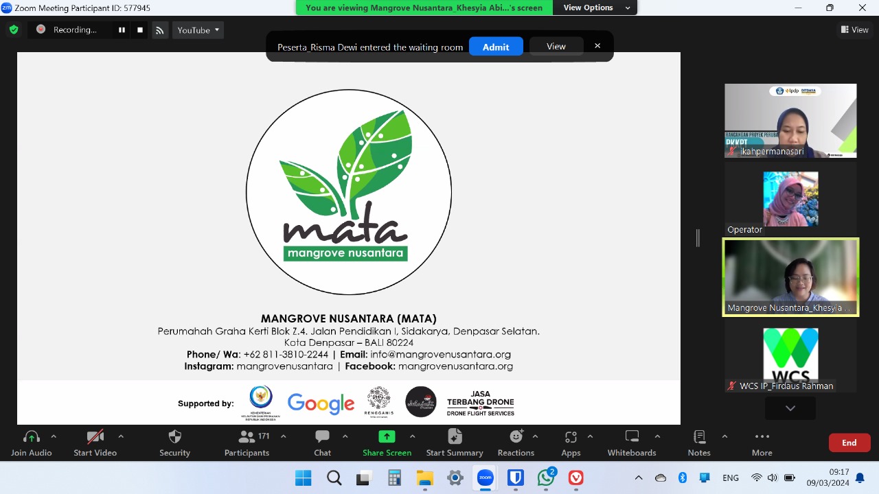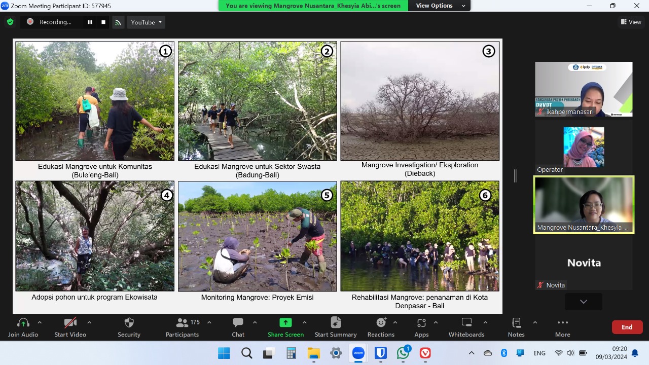 Khesyia Abigail Makhas, M.Env.Sc. dari Mangrove Nusantara, memaparkan tentang kegiatan dan upaya yang dilakukan oleh organisasi untuk melestarikan mangrove di berbagai daerah. Beliau juga menjelaskan beragam aspek terkait mangrove, termasuk zonasi, jenis-jenis, peran penting, serta tantangan dan ancaman yang dihadapi oleh ekosistem ini.